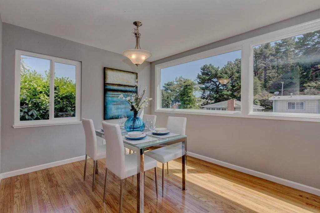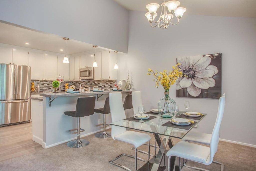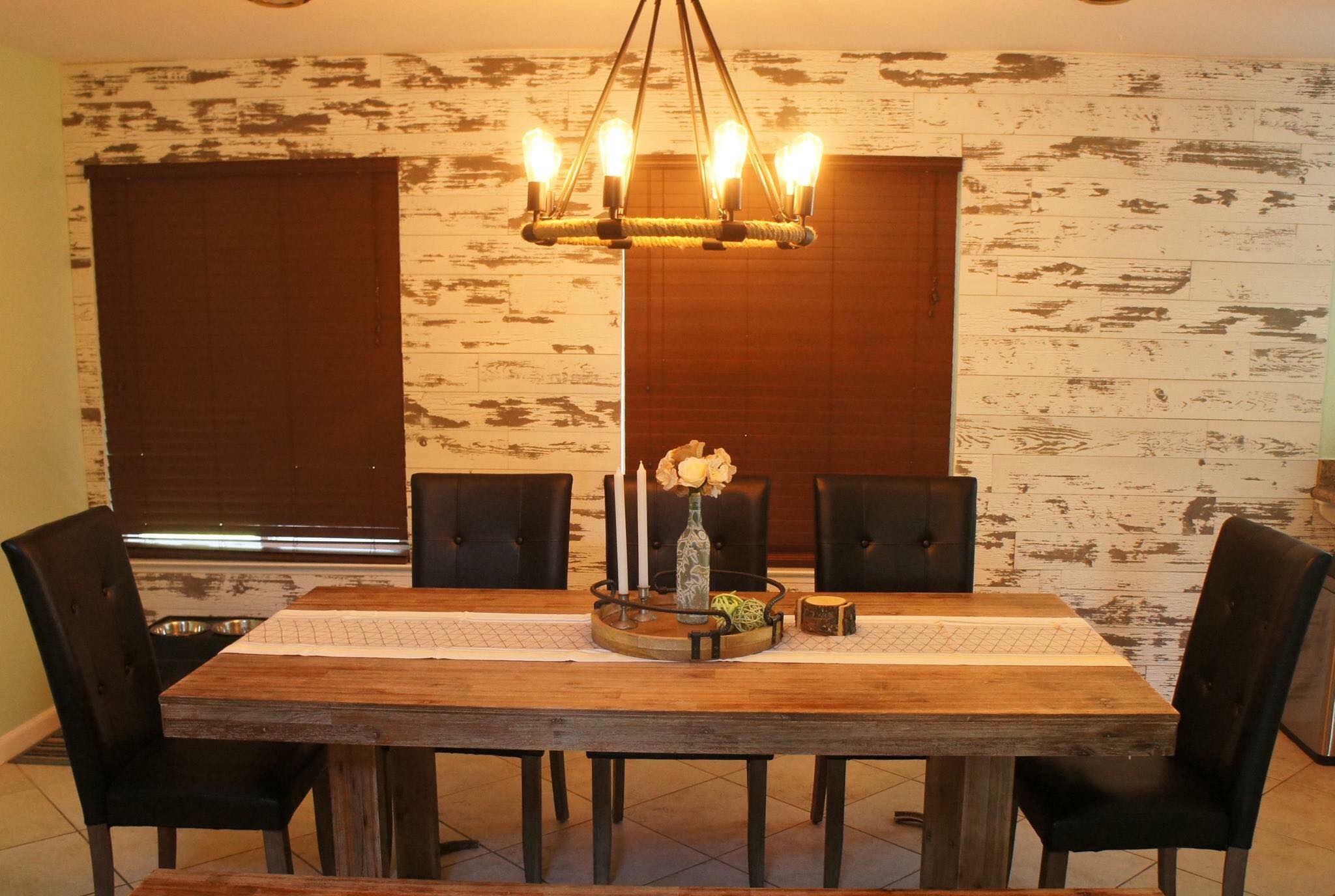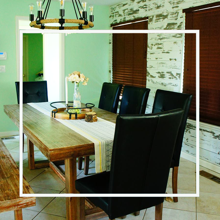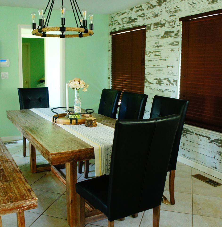Beautiful Milpitas home, upgraded the space by adding matching furniture to the existing farmhouse style dining piece, also mounted distressed wood planks to the dining space background wall to accentuate the focal point of the space along with industrial ceiling chandelier and many more farmhouse style accent pieces to complete the look