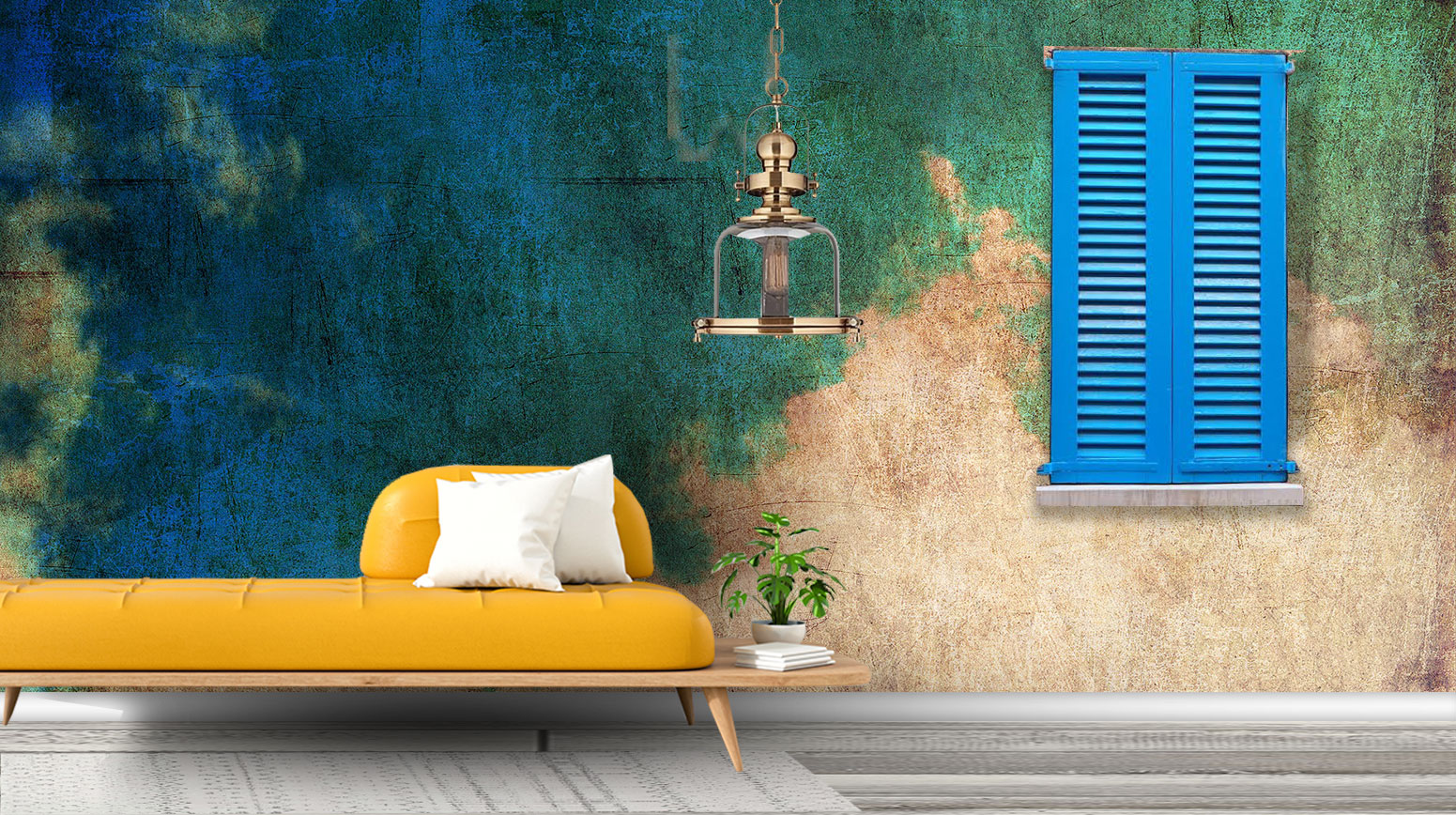 Very modern high ceiling apartment with white and grey shaded sleek furniture selections having bright teal and yellow accessories to enrich the living space and bring in the warmth